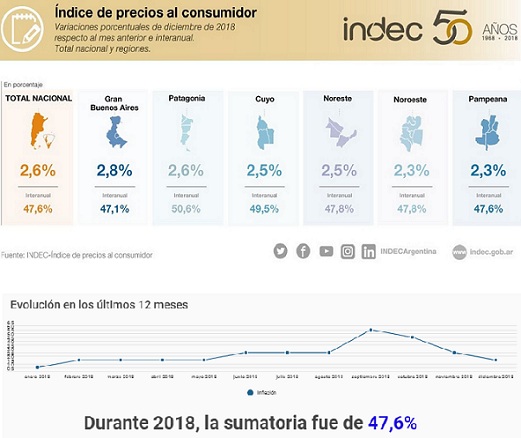 Según el INDEC "la inflación acumuló 47,6% en 2018", impulsada por el transporte y los alimentosEl índice de Precios al Consumidor aumentó 2,6% en diciembre y sumó un alza de 47,6% durante 2018, informó el Indec. |