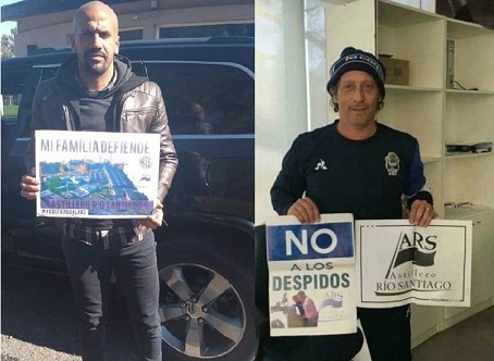 Tanto el presidente de Estudiantes de La Plata como el DT del "Lobo" se solidarizaron con la llucha de los trabajadores de Astilleros R铆o Santiago posando con carteles identificados con esa causa.