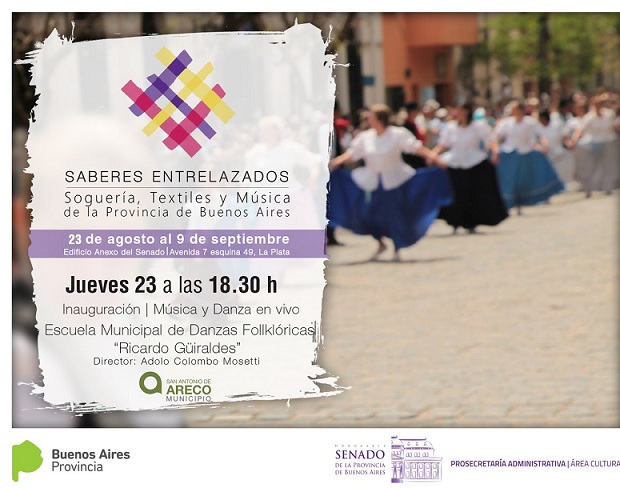 La Muestra "Saberes Entrelazados. Soguer铆a, Textiles y M煤sica de la Provincia de Buenos Aires" dar谩 comeinzo este 23 de agosto y estar谩 abierta al p煤blico hasta el 9 de septiembre. La inauguraci贸n ser谩 este jueves a las 18.30 hs. con m煤sica y danza en vivo, en el Edificio Anexo del Senado bonaerense sito en Av. 7 esq. callle 7 de La Plata. Entrada libre y gratuita. Organizan la Prosecretar铆a Administrativa de la Honorable C谩mara de Senadores de la Provincia de Buenos Aires y la Escuela Provincial de Artesanos.