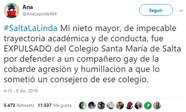 El pap谩 del joven que fue discriminado en un colegio de elite salte帽o cont贸 detalles del acto de homofobiaSu hijo fue increpado por las autoridades por utilizar una pulsera con los colores del colectivo LGBT y los j贸venes que lo apoyaron fueron expulsados. |
