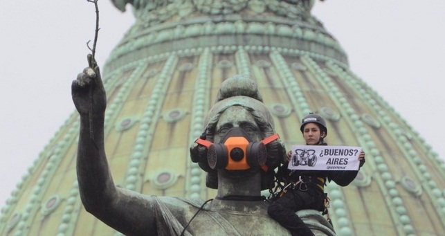 CABA: Con una máscara de oxígeno en una estatua, Greenpeace pide aire limpioEsta mañana activistas de Greenpeace escalaron la estatua de 23 metros de la Plaza del Congreso, construida en alegoría a la República, y le colocaron una máscara de oxígeno para reclamar al gobierno porteño más estaciones para medir la polución. |