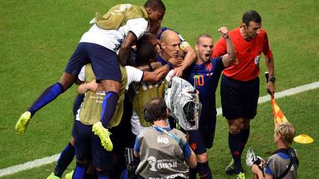 Con dos goles de Van Persie, dos de Robben y otro De Vrij, Holanda le gan贸 a Espa帽a por 5 a 1 en Salvador por el Grupo B. Xabi Alonso de penal hab铆a abierto el marcador.