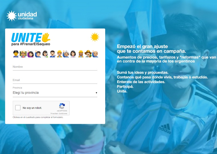 Unidad Ciudadana lanzó una web contra el "ajuste" del Gobierno nacionalLa web, presentada en las redes sociales por CFK, informa sobre cambios en la legislación laboral y previsional que pretende el Gobierno, y lanza distintas acciones de difusión, convocatorias, y la circulación de diferentes materiales informativos sobre como impactarán en el caso de aprobarse en el Congreso las distintas reformas. |