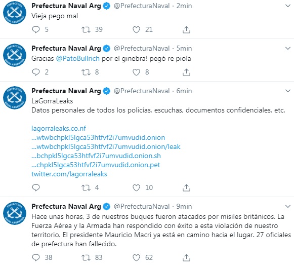 Hackearon el Twitter de Prefectura: "Gracias Bullrich por la ginebra"Este mediodía la cuenta de la fuerza sufrió un ataque cibernético en el que desconocidos publicaron mensajes falsos y hasta filtraron documentación confidencial. |
