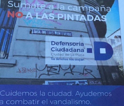 La  Defensora Ciudadana de La Plata, María Florencia Barcia, lanzó la Campaña #NoAlasPintadas #NoAlasPegatinas ante la gran cantidad de pintadas y pegatinas de afiches que aparecieron arruinando las fachadas de muchos edificios públicos con motivo del proceso pre electoral.
