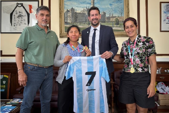 El presidente del Concejo Deliberante de La Plata, Marcelo Galland y el subsecretario de Deporte municipal, Angel Cerisola, recibieron este jueves a Julieta Mar铆a Mart铆n y Sandra Llanaje, integrantes de la Selecci贸n Argentina femenina de f煤tbol para ciegas, Las Murci茅lagas, que se consagraron campeonas del Mundial Kochi India 2025.