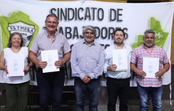 Posteriormente, en la sede del Sindicato de Trabajadores Municipales se llev贸 adelante la firma para la registraci贸n del Convenio Colectivo de Trabajo Municipal de General Madariaga. All铆 estuvieron junto al ministro Correa y al intendente Santoro, el presidente del Concejo Deliberante, Marcos Jovanovich, el delegado normalizador de los Municipales y los representantes de ATE, M贸nica G贸mez, y de UPCN, Adolfo M茅ndez. Tambi茅n participaron la jefa de Gabinete del ministerio de Trabajo, Cecilia Cecchini, y la directora de la Coordinaci贸n de la Negociaci贸n Colectiva Municipal, Macarena Kunkel.