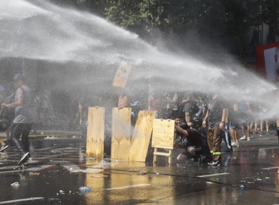 En las imágenes pudo observarse a varias personas resguardadas detrás de maderas y estructuras improvisadas mientras preparan el elemento, que luego es encendido y arrojado en dirección a los efectivos.
