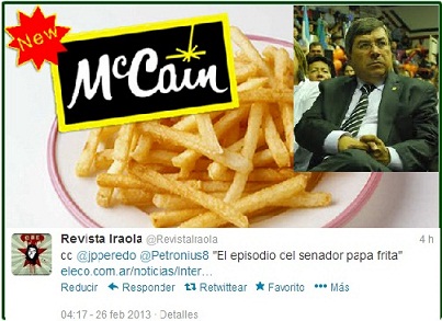 Un apresurado Fernández comunicó mediante la iniciativa parlamentaria de su autorÃa donde de manera "tremendista" y "apocalÃtica" mostraba su preocupación por la ida de la empresa McCain de Argentina. El proyecto del titular de la bancada radical solo fue presentado por Mesa de Entradas del Senado bonaerense, dado que todavÃa no comenzaron las sesiones legislativas ordinarias en la Provincia y ni siquiera tiene estado parlamentario; pero el tandilense Carlos Fernández lo publicitó como una "preocupante caso, encendiendo una alarma roja", que llevo a que la empresa contestara: "McCain Foods Limited, propietaria de los negocios de McCain en Sudamérica, desmiente de manera tajante los rumores que señalan que la compañÃa se irá de la Argentina". Fernández, en su publicitado proyecto que no llegó a los grandes medios nacionales; pero si fue ampliamente divulgado por el diario "El Eco" de Tandil manifestó "solicitamos la intervención de las autoridades ejecutivas provinciales con el convencimiento de que no hay peor estado que el de la incertidumbre. Esperamos que la empresa McCain no cuente con el peor desenlace dentro de nuestro paÃs ya que las consecuencias para la ciudad de Balcarce y su zona de influencia serÃan catastróficas desde el punto de vista económico, no sólo por los 700 puestos de trabajo directos y de los 3000 puestos laborales indirectos, que quedarÃan vacantes, sino porque se irÃa del paÃs una empresa que viene generando desde el año 1995 un espiral positivo de crecimiento y desarrollo en la zona planteada". Ante la desmentida de McCain, también publicada por el mismo medio de la ciudad serrana, desde el Twitter de Revista Iraola, la "Barcelona tandilense" lo calificaron de "senador para frita", adjuntando el link de la desmentida de la transnacional. Revista Iraola ?@RevistaIraola cc @jpperedo @Petronius8: "El episodio del senador papa frita". Los tÃtulos de "El Eco" de Tandil Preocupación legislativa por versiones sobre posible retiro del paÃs de la empresa McCain McCain rechazó que vaya a dejar el paÃs El Comunicado oficial de McCain MCCAIN NIEGA QUE VAYA A DEJAR EL PAIS Febrero de 2013 - McCain Foods Limited, propietaria de los negocios de McCain en Sudamérica, desmiente de manera tajante los rumores que señalan que la compañÃa se irá de la Argentina. "Hemos hecho una inversión de capital muy significativa al establecer las operaciones en la Argentina hace 17 años y hemos continuado realizando inversiones en el paÃs y en la región para desarrollar nuestro negocio", señaló Frank Van Schaayk, Presidente Regional para las Américas. "Sudamérica está considerado uno de los mercados de mayor crecimiento en el mundo, por lo que estamos convencidos de continuar invirtiendo en la región, incluÃda la Argentina. Nuestra planta de la ciudad de Balcarce y nuestra oficina comercial en Buenos Aires son clave en nuestro negocio actual y para el futuro". En diciembre de 2012, McCain designó a Paolo Picchi en el nuevo rol de Presidente para Latinoamérica como un modo de destacar la importancia estratégica de la región para el desarrollo del negocio de la compañÃa. Nacido en Brasil, y con más de 20 años de experiencia en la industria alimenticia -¬incluyendo destinos en Argentina, Francia y México- Picchi controla las operaciones y mercados de McCain en México, América Central y Sudamérica, desde la oficina comercial establecida en San Pablo, Brasil. |