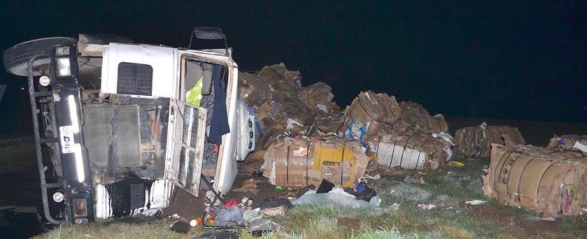 Efectivamente, se inform贸 que en la madrugada de hoy, un cami贸n de cargas que llevaba cart贸n compactado y que circulaba munido de acoplado, protagoniz贸 un vuelco en la rotonda de la Ruta 51.