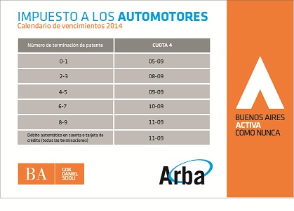 A partir de este viernes 5 y hasta el 11 de septiembre opera el vencimiento de la cuota 4 del Impuesto a los Automotores, que puede además de pagarse por Home Banking, cajero o débito automático, puede abonarse con tarjeta de crédito desde la web de la Agencia de Recaudación de la provincia de Buenos Aires. Para quienes estén adheridos al sistema de débito automático en cuenta bancaria o utilicen la opción de pago con tarjeta de crédito, el vencimiento de Automotores operará el 11 de septiembre, sin importar el dominio del vehÃculo. En tanto que para el resto de los contribuyentes, el plazo operará de la siguiente forma: las patentes terminadas en 0 y 1 vencerán el dÃa 5; las finalizadas en 2 y 3, el dÃa 8; en 4 y 5, el 9; en 6 y 7, el 10; y en 8 y 9, el 11 de septiembre. El director ejecutivo de de ARBA, Iván Budassi, recordó que "este nuevo servicio que pusimos en marcha por Internet busca simplificar y agilizar la gestión de pago. Ahora, los contribuyentes pueden entrar en www.arba.gov.ar para bajar su impuesto y pagarlo en forma electrónica desde el mismo sitio". Respecto de las últimas novedades tecnológicas de la Agencia, destacó que "también hemos desarrollado una aplicación para dispositivos que utilizan el sistema operativo Android, que posibilitará pagar impuestos, efectuar trámites y denunciar casos de evasión fiscal a través de celulares y tablets". Budassi recomendó a los contribuyentes "entrar a la web de Arba para adherirse al servicio de boleta por mail", que permite recibir antes de cada vencimiento los recordatorios de pago directamente en el correo electrónico". Oficialmente se informó que los ciudadanos que tributan el Impuesto a los Automotores reciben, por buen cumplimiento fiscal, una bonificación del 5% en el monto de cada cuota. Al mismo tiempo, en esta oportunidad, se suma un 2% para aquellos que efectúen el pago del saldo anual. Para obtener mayor información, o realizar cualquier tipo de consultas, los contribuyentes pueden llamar a la lÃnea gratuita de Arba: 0800-321-ARBA (2722), de lunes a viernes de 7 a 19 horas.