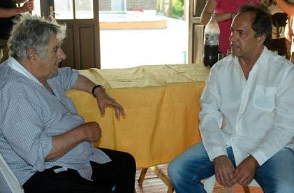 El gobernador Daniel Scioli destac贸 los valores del presidente uruguayo, Jos茅 "Pepe" Mujica, durante un extenso encuentro que mantuvieron en El Quincho de Varela, finalizado el acto electoral en este pa铆s, y luego se acerc贸 hasta la sede del Frente Amplio para saludar al candidato presidencial de ese partido, Tabar茅 V谩zquez, quien agradeci贸 la presencia del mandatario provincial.