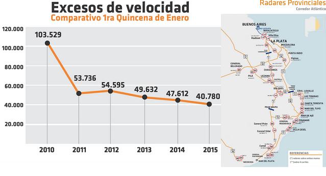 Un muestreo de la Jefatura de Gabinete de la Provincia realizado sobre tres radares instalados en la AutovÃa 2 determinó que se redujeron un 60,61% las infracciones por exceso de velocidad durante la primera quincena desde el 2010 y un 14,34% respecto del último año. Comparando los mismos lugares de control del año anterior, se detectó una disminución de 6.832 casos de excesos de velocidad, en relación a las infracciones detectadas en la primera quincena de 2014. Las autoridades realizaron 46.224 controles vehiculares en las rutas.
