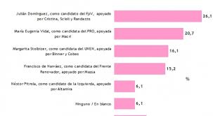 La consultora R. Rouvier & Asociados realiz贸 un estudio durante fines de febrero y principios de marzo sobre el tablero electoral bonaerense y los resultados arrojaron que el titular de la C谩mara de Diputados de la Naci贸n, Juli谩n Dom铆nguez encabeza la intenci贸n de voto y en segundo lugar, Mar铆a Eugenia Vidal.