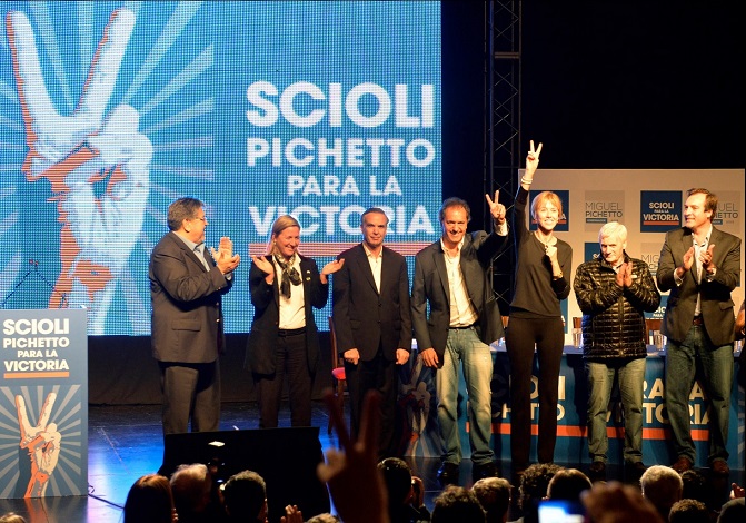 El gobernador Daniel Scioli firm贸 hoy con el senador nacional y candidato a gobernador por R铆o Negro, Miguel Pichetto, un Acta de Compromiso para acompa帽ar la Nueva R铆o Negro del Desarrollo, durante el cierre de su campa帽a, en el teatro La Baita de la ciudad de San Carlos de Bariloche.