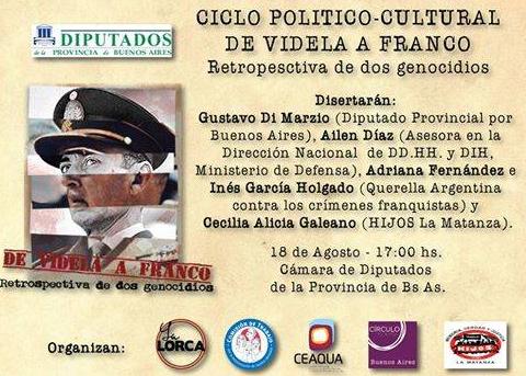 El diputado provincial por el Frente para la Victoria, Gustavo Di Marzio, la asesora en la Dirección Nacional de DDHH, Ailen Díaz; los miembros de la querella Argentina contra los crímenes Franquistas, Adriana Fernández e Inés Holgado y Cecilia Alicia Galeano, de HIJOS La Matanza, abrirán el ciclo Político y Cultural "De Videla a Franco" que se llevará a cabo en el anexo de la Cámara de Diputados de la Provincia, sito en calle 53 entre 8 y 9.