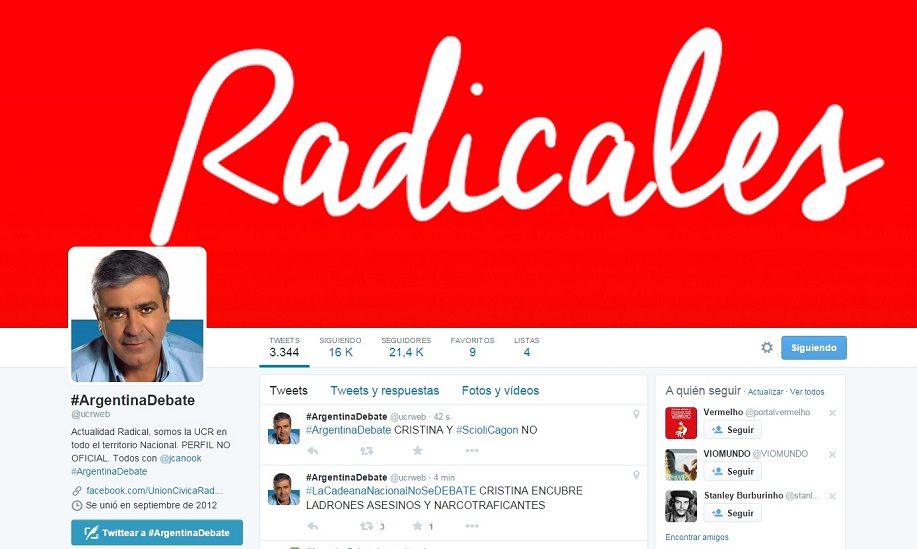 La cuenta de Twitter @ucrweb que se presenta como "Actualidad Radical, somos la UCR en todo el territorio Nacional. PERFIL NO OFICIAL. Todos con @jcanook #ArgentinaDebate" se enmascaró tras el hashtag o etiqueta #ArgentinaDebate y a disparado contra Daniel Scioli y CFK mensajes agraviantes e insultantes en las últimas 24 horas.