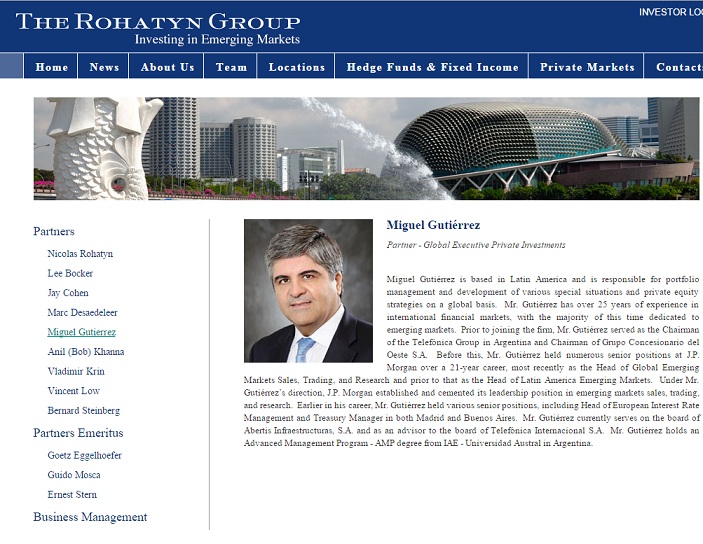 Por último, hay que señalar que Miguel Angel Gutiérrez es socio fundador de The Rohatyn Group. Se desempeñó como Presidente y CEO de Telefónica Argentina S.A. entre los años 2001 y 2003, Presidente de la Asociación de Empresas de Servicios Públicos de Argentina (ADESPA) y Vice-Presidente de la Fundación Cámara Española de Comercio. Es miembro del Consejo Asesor de Telefonía para Latinoamérica, del Centro de Implementación de Políticas Públicas para la Equidad y el Crecimiento (CIPPEC), del Consejo Económico y Social de la Universidad Torcuato Di Tella y del Consejo Consultivo Internacional del IAE Business School (Universidad Austral) y actualmente desde el 22 de diciembre pasado fue nombrado director por las acciones clase D en YPF.