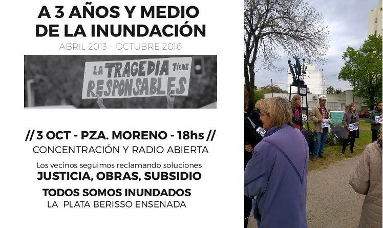 Bajo consignas como: "No abandonamos la lucha"; "ES AHORA"; "No Perdonamos"; "Siempre en la calle"; "Lo reclamos siguen vigentes"; "Seguimos reclamando por soluciones"; "Seguimos exigiendo JUSTICIA", a tres a帽os y medio de la tr谩gica inundaci贸n del 2d e abril de 2013, Asambleas, Victimas de la Inundaci贸n, Familiares de Victimas, Indignados convocan a Plaza Moreno, este lunes 3 del corriente a las 18; a una concentraci贸n y radio abierta.