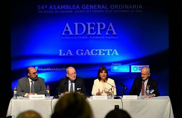 La ministra de Seguridad, Patricia Bullrich, present贸 este s谩bado, ante la Asamblea General de Adepa, el Protocolo General de Actuaci贸n para la Protecci贸n de la Actividad Period铆stica.