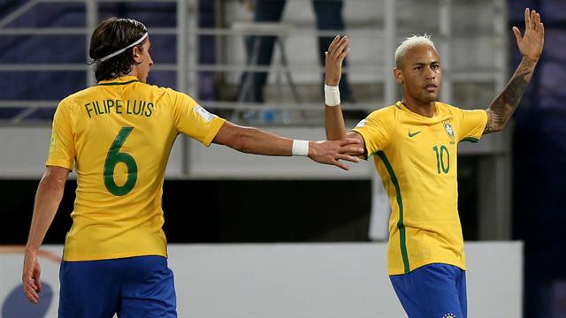 Neymar (fue amonestado y se perder谩 el partido del martes ante Venezuela en M茅rida) encabez贸 una contra y permiti贸 la definici贸n en soledad de Filipe Luis para el tercero (39m.).