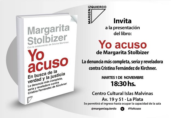 Este martes 1 de noviembre, en el Salón Auditorio del Complejo Cultural "Islas Malvinas", ubicado en calle 19 y 51, la diputada nacional Margarita Stolbizer, presentará su libre "Yo acuso", de la editorial Margen Izquierdo, en el que realiza las denuncias más completas, seria y reveladoras contra la ex presidenta Cristina Fernández de Kirchner.