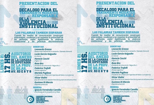 En la Cámara de Diputados de la Provincia de Buenos Aires se llevará a cabo este lunes a las 17 la presentación del "decálogo para el tratamiento mediático responsable de la violencia institucional"; con la participación de periodistas, Rosa Bru, el juez en Casación Penal VÃctor Violini y los legisladores Leonardo Grosso y Gustavo Di Marzio.