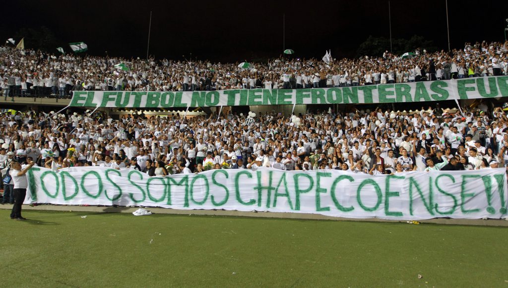 Todos los aficionados llegaron al estadio ataviados con prendas blancas, portando velas encendidas y dispuestos a hacer un minuto de silencio para recordar a los fallecidos en este accidente que dejó a seis sobrevivientes, cuatro de ellos futbolistas.