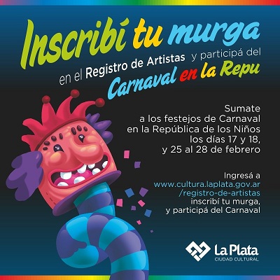 La Municipalidad de La Plata, a través de la SecretarÃa de Cultura y Educación, informa que se encuentra abierta la convocatoria a murgas de toda la ciudad para los festejos de carnaval que se llevarán en La República de los Niños durante el mes de febrero.