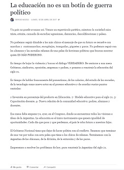 "Es tiempo de hablar francamente del presentismo, de los salarios, del estado de las escuelas, de la tecnología como nuevo actor en el proceso educativo y de acordar cuatro puntos centrales: 1-Inversión en porcentaje del producto en Educación. 2- Modelo educativo para el siglo 21. 3- Capacitación docente. 4- Nueva relación de la comunidad educativa, entre padres, alumnos y docentes".