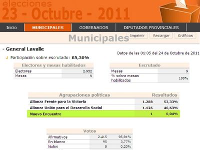 Ahora, la víctima del desaire electoral -por parte de compañeros de lista, familiares y amigos- fue el candidato de Nuevo Encuentro, Alberto Butrón, quien sobre el 100 por ciento de lo escrutado obtuvo 0,02 por ciento, es decir un solo voto, el suyo se supone.