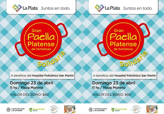 La Municipalidad de La Plata en conjunto con la Asociación de Cocina Regional Argentina (A.C.R.A.) y 60 instituciones de la Red de Voluntariado de la ciudad llevarán adelante una paella regional de hortalizas a beneficio del Hospital Policlínico San Martín, el próximo domingo 23 en Plaza Moreno.