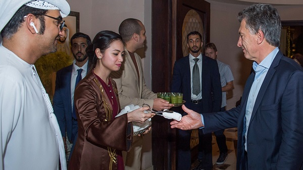 En el marco de una reunión con el ministro Asistente de Relaciones Exteriores y Cooperación Internacional para Asuntos Económicos y de Comercio de ese país, Mohammed Sharaf, y un grupo de empresarios interesados en realizar inversiones, el presidente Mauricio Macri destacó que los Emiratos Árabes Unidos representan un "socio estratégico" para la Argentina. El mandatario insistió con una idea que retoma en cada foro internacional o en cada visita al exterior: que la Argentina se encuentra en un "nuevo momento político" en el cual ve al mundo desarrollado como "una oportunidad de crecimiento", al que propone relaciones internacionales "inteligentes que generen beneficios mutuos". En ese sentido, dijo que el Gobierno también está creando condiciones para que las empresas argentinas mejoren su infraestructura, aumenten la producción con mayor valor agregado y exporten más. Ante los funcionarios convocados en el Palace Dowtown, recordó que la Argentina tiene capacidad para generar alimentos que cubran las necesidades de 400 millones de personas y ratificó que el objetivo es darle elaboración a esos productos primarios. En materia energética, mencionó las enormes posibilidades de explotación del yacimiento de Vaca Muerta para el cual existen varias empresas interesadas en participar en alianza con YPF. También señaló que el país está en proceso de multiplicar su matriz energética renovable, a través de inversiones en infraestructura eólica y solar. En ese marco, destacó las obras que se están realizando y los proyectos en marcha sobre transporte, especialmente lo relacionado a los vuelos comerciales. "Conectamos siete provincias al mundo en 18 meses", señaló Macri al mencionar los trabajos de mejoras y ampliación de terminales aéreas en el interior del país. De la reunión entre funcionarios locales y argentinos participaron los gobernadores de Río Negro, Alberto Weretilneck; y de San Juan, Sergio Uñac; los ministros de Transporte, Guillermo Dietrich; de Energía, Juan José Aranguren, y de Finanzas, Luis Caputo. También estuvieron el titular de la Cámara de Diputados, Emilio Monzó; el secretario de Asuntos Estratégicos, Fulvio Pompeo; el embajador argentino Fernando De Martini, y el presidente de la Sociedad Rural Argentina, Luis Etchevehere. A su turno, el ministro Sharaf manifestó que su país está interesado en estrechar la relación bilateral y resaltó el potencial que tiene la Argentina en seguridad alimentaria para proveerle al mundo. Dijo que existe un amplio campo para explorar términos de inversiones y cooperación con la Argentina y señaló que EAU importa el 80 por ciento de sus requerimientos alimentarios. Mencionó que EAU puede "aportar mucho" para cooperar con la Argentina en el desarrollo de los vuelos comerciales. Al término de la reunión general, los ministros mantuvieron encuentros bilaterales con funcionarios y empresarios de los Emiratos Árabes a quienes les detallaron las oportunidades de inversión que hay en la Argentina. Más tarde, el presidente Macri será recibido por el Vicepresidente y Primer Ministro, Sheik Mohammend Bin Rashid Maktoum, en el Palacio Zaabeel. Hacia la noche, junto a su comitiva y la primera dama, Juliana Awada, dejarán Emiratos Árabes para trasladarse a China, donde continuarán con las actividades previstas en la gira, entre otras, un encuentro con su par de ese país, Xi Jinping. La visita a la República de China Macri y Awada serán recibidos a las 6.50 del domingo -hora de Argentina- por Xi Jinping y su esposa, en el Gran Palacio del Pueblo. Ambos presidentes mantendrán una "reunión informal", según informó Presidencia de la Nación a través de un comunicado de prensa. Después de ese encuentro, Macri asistirá a una comida de bienvenida que el mandatario chino ofrecerá a los jefes de Estado que participarán del "Foro de Una Franja y Una Ruta para la Cooperación Internacional", actividad prevista para las 7.30. En otra actividad, que compartirá con Awada, el presidente Macri asistirá a una gala cultural que se realizará en la Sala Opera House, desde las 9. A las 22.30 del domingo está anunciado que Macri vuelva a verse con Xi Jinping en el Centro Internacional de Conferencias Yanqi Lake, donde el presidente de China estará, entre las 23 del domingo y la 1 del lunes, siempre hora argentina, en una mesa de trabajo con los mandatarios que asistirán al foro. A las 0 del martes, Macri se reunirá con el presidente de la empresa China National Offshore Oil Corporation, y luego participará de la clausura del Foro de Negocios e Inversiones Argentina-China. A la 1.20 hora argentina, según lo informado por Presidencia, el mandatario argentino tendrá un almuerzo con 33 empresarios chinos. Ya el martes, a las 6 de la mañana, Macri dará una conferencia en la Academia China de Ciencias Sociales, se reunirá con su presidente y contestará preguntas de los asistentes. Al finalizar esa actividad, se dirigirá, a las 8.45, a una recepción en el hotel World Summit Wing con motivo del 45º aniversario del establecimiento de las relaciones diplomáticas entre la Argentina y China. El miércoles, a las 4.15 hora argentina, junto con su esposa, el Presidente depositará una ofrenda floral a Mao Tse Tung en la Plaza Tiananmen, donde se encuentra el monumento nacional de la República Popular de China a los mártires de la lucha revolucionaria en los siglos XIX y XX. Tras el homenaje en la plaza, aproximadamente a las 4.30, el Presidente se reunirá con el primer ministro chino, Li Keqiang, en el Gran Palacio del Pueblo y, acto seguido, con el presidente del Comité Permanente de la Asamblea Nacional Popular, Zhang Dejiang. A las 6.15, volverán a verse Macri y Xi Jinping, también en el Gran Palacio del Pueblo, en una reunión en la que participarán las comitivas de ambos mandatarios y que se desarrollará en el Salón Este. El resultado de las conversaciones se plasmará a continuación de es