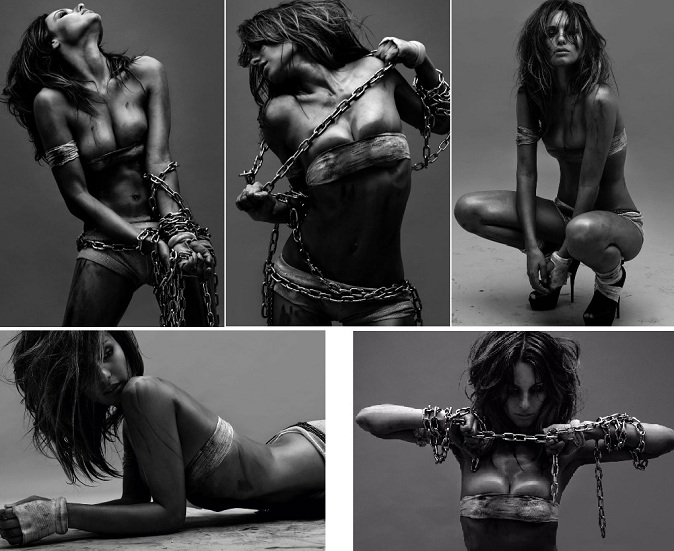 En la sensual e infartante producción fotográfica se la ve se la ve engrasada, despeinada y con cadenas.