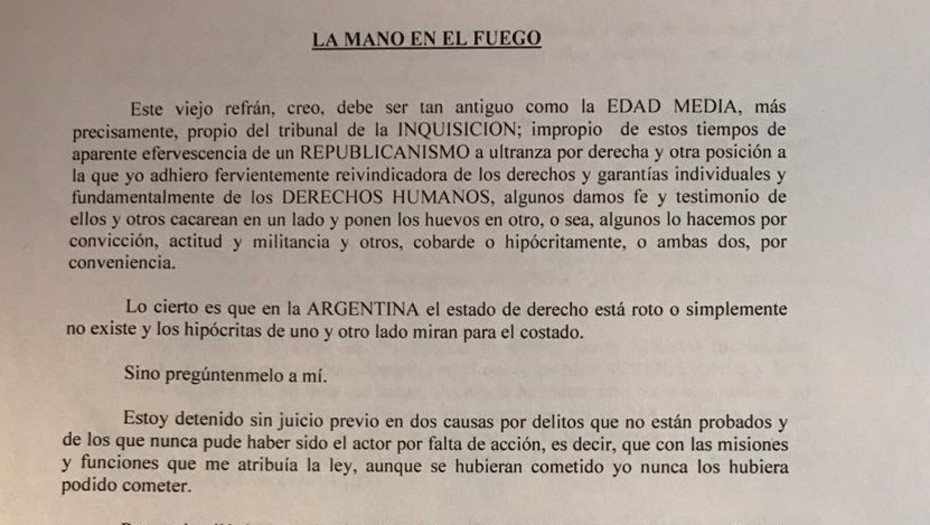 "Como todo tiene que ver con todo, d铆as anteriores a mi arbitrario e ilegal pedido de detenci贸n ocurri贸 algo que sin duda alguna tuvo una particular influencia en los medios y no dudo que tambi茅n en el Congreso. Fue cuando alguien dijo, al ser consultado de mi gesti贸n, que no pon铆a las manos en el fuego por nadie salvo por su entorno familiar 铆ntimo. Todo muy simult谩neo, todo muy coincidente. Demasiado expl铆cito", desliz贸 en la carta de dos carillas que titul贸 "La mano en el fuego".
