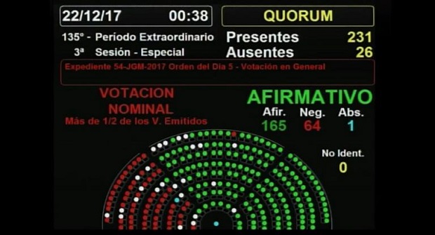 En otra sesi贸n marat贸nica, Cambiemos logr贸 a medianoche en la 煤ltima sesi贸n del a帽o en la C谩mara de Diputados aprobar y girar al Senado el proyecto de Presupuesto 2018. Tras casi 13 horas de debate, el tablero del recinto reflej贸 165 votos afirmativos, 64 negativos y 1 abstenciones. Para alcanzar ese score, el oficialismo logr贸 sumar los votos de los diputados del interbloque Argentina Federal, del Frente Renovador y del bloque Evoluci贸n Radical que lidera Mart铆n Lousteau. Por el contrario, el Frente para la Victoria-PJ, el Movimiento Evita y el Frente de Izquierda ratificaron su voto negativo y hablaron de un "presupuesto de ajuste y endeudamiento". A continuaci贸n se votar谩n otras iniciativas comprendidas en el Pacto Fiscal rubricada por los gobernadores en noviembre pasado. La sesi贸n En el marco de un fin de a帽o tenso por la resistencia que despert贸 en un sector de la sociedad el tratamiento expr茅s de reformas econ贸micas exigidas por el Gobierno (especialmente la previsional), Cambiemos apunta a lograr en la 煤ltima sesi贸n del a帽o no s贸lo el Presupuesto sino tambi茅n la pr贸rroga del impuesto al Cheque, la ley de Consenso Fiscal, y la de Responsabilidad Fiscal y Buenas Pr谩cticas de Gobierno. El miembro informante del oficialismo, Luciano Laspina (PRO), destac贸 que una meta planteada en la discusi贸n del Presupuesto 2018 ser谩 la reducci贸n en un punto del PBI del d茅ficit fiscal, llev谩ndolo al 3,2%. Tambi茅n se帽al贸 que se prev茅 un crecimiento econ贸mico del 3,5%, una inflaci贸n promedio del 15,7%, un d贸lar a $19,30, y un incremento de la inversi贸n del 12%. Al margen de las proyecciones macroecon贸micas, Laspina se refiri贸 a la composici贸n del gasto y al respecto detall贸 que en los a帽os del kirchnerismo "las ampliaciones presupuestarias representaron en promedio el 18 por ciento de los cr茅ditos iniciales", lo cual desembocaba en una asignaci贸n "discrecional" de recursos por parte del Poder Ejecutivo a trav茅s de decretos de necesidad y urgencia. "Hac铆an de esta ley de presupuesto un verdadero dibujo y un sinsentido", cuestion贸 el legislador santafesino, que acto seguido marc贸 la diferencia respecto del Presupuesto 2017 confeccionado por el macrismo, respecto del cual se verific贸 un "desv铆o de apenas el 2,8 por ciento", en tanto que "las modificaciones presupuestarias representaron un 0,3 por ciento del cr茅dito inicial". Laspina rese帽贸, en este sentido, que el 2014 marc贸 el "pico hist贸rico" en t茅rminos de desv铆o presupuestario, alcanzando el 34 por ciento: "Fue decidido arbitrariamente por el Gobierno nacional ri茅ndose del Congreso nacional". Por otra parte, destac贸 que el dise帽o presupuestario sintetiza "una ingenier铆a pol铆tica y fiscal de enorme magnitud" porque al mismo tiempo que contempla una baja de la presi贸n impositiva para cumplir con las "metas de solvencia fiscal", no escatima en recursos dirigidos a "reducir la brecha en materia de deuda social e infraestructura". "Estamos hablando de una ingenier铆a pol铆tica y fiscal de enorme magnitud, quiz谩s el desaf铆o m谩s grande que tenemos los argentinos para poder salir adelante, crecer sin tener una nueva crisis en el futuro", afirm贸. Al adelantarse a las cr铆ticas de la oposici贸n respecto del financiamiento del gasto con el aumento de la emisi贸n de deuda, Laspina explic贸 que el nivel de endeudamiento que tiene Argentina en la actualidad, cercano al 28 por ciento, "es absolutamente sostenible" y est谩 por debajo del promedio latinoamericano del 42 por ciento. Sin embargo, el diputado del Frente para la Victoria-PJ Axel Kicillof fue muy duro respecto del nivel de endeudamiento fijado en el presupuesto, en el que los servicios de deuda aparecen como el principal gasto de la administraci贸n central. Luego de denunciar que los intereses de la deuda p煤blica crecieron un 72 por ciento, y que el a帽o que viene el Estado nacional desembolsar谩 406.000 millones de pesos en ese concepto ("cuatro veces lo que le sacan a los jubilados"), el exministro de Econom铆a consider贸 que el Presupuesto 2018 "nace muerto" y expresa el "programa econ贸mico neoliberal". Para Kicillof, el proyecto "nace muerto" y "no sirve" porque en el momento en que fue presentado en septiembre pasado no tomaba en cuenta los efectos del paquete de "reformas p茅simas" que viene siendo tratado en diciembre en el Congreso. "Es letra muerta. No lo pueden cumplir. Nace muerto este presupuesto porque no incluye las reformas que han aprobado", juzg贸 el legislador kirchnerista, que adelant贸 el voto negativo del FpV como "testimonio de nuestra defensa de los intereses populares". "Necesitamos que defiendan a la clase media, a los jubilados donde tienen una base electoral. Pero ustedes ya soltaron el ancla y est谩n aplicando el programa econ贸mico neoliberal", sentenci贸 Kicillof, que compar贸 el rumbo actual de la econom铆a con las pol铆ticas econ贸micas de Domingo Cavallo en los noventa. A su turno, Diego Bossio (Bloque Justicialista) afirm贸 que cree "cada vez menos en el Presupuesto como un instrumento de pol铆tica econ贸mica" ya que "las facultades que tiene el Poder Ejecutivo son cada vez mayores". Si bien reconoci贸 que el Congreso "no puede involucrarse en la pol铆tica monetaria", advirti贸 que las decisiones en esa materia, en particular los movimientos del tipo de cambio y de las tasas de inter茅s, son determinantes en la definici贸n de "la estructura econ贸mica y del perfil productivo" del pa铆s. Por su parte, Graciela Cama帽o (Frente Renovador) record贸 que el a帽o pasado el oficialismo "subestim贸 la inflaci贸n y sobrestim贸 el crecimiento" en la elaboraci贸n del presupuesto, y se帽al贸 que cuando eso sucede "hay gato encerrado". "Cuando un presupuesto subestima la inflaci贸n y sobrestima el crecimiento, hay gato encerrado. Es un ajuste encubierto. Si yo proyecto gastar el a帽o que viene un 16 por