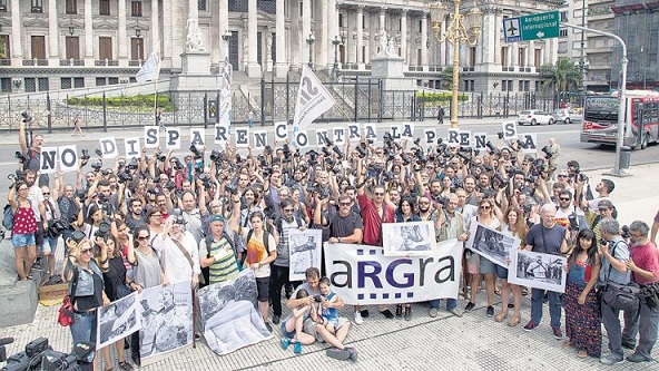 El acto, organizado por la Asociación de Reporteros Gráficos de Argentina (ARGRA) y el Sindicato de Prensa de la Ciudad de Buenos Aires (SiPreBA) bajo las consignas "No disparen contra la prensa" y "Libertad para informar", expresó la preocupación ante los más de 30 trabajadores de prensa heridos en las movilizaciones contra la reforma previsional, donde también hubo cuatro reporteros detenidos.