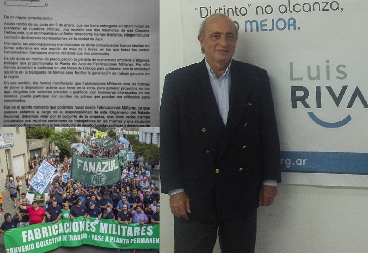 Riva asegur贸 que "la situaci贸n que afecta hoy a la sociedad en Azul es parte de este proceso que, sin dudas, ser谩 beneficioso para el pa铆s en su conjunto. Los efectos locales deber谩n ser evaluados en ese contexto, reiterando que Fabricaciones Militares participar谩 en acciones regionales que se encaren en la medida de sus posibilidades".