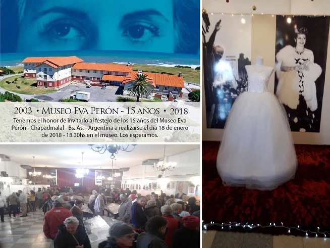 Este jueves 18 del corriente el Museo Eva Per贸n de Chapadmalal festeja sus 15 a帽os de existencia con una intervenci贸n art铆stica sobre Eva Per贸n, donde se mostrar谩 un vestido de "la Abanderada de los humildes". Fue creado por el secretario de Turismo de la Naci贸n de ese entonces, Daniel Scioli bajo la presidencia de Eduardo Duhalde y actualmente sigue dependiendo del Ministerio de Turismo de la Naci贸n y se encuentra toda la historia del complejo hotelero, donde miles de ni帽os y adolescentes argentinos por primera ves disfrutaron de unas vacaciones dignas y vivieron "sus d铆as m谩s felices e inolvidables", de la mano de aquel primer peronismo fundacional que tuvo en Evita, "el motor de la justicia y dignidad social".