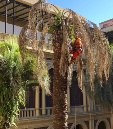 Personal de mantenimiento de Casa de Gobierno y de una empresa especializada podaron y retiraron del Patio de Honor la palmera Yatay que se secó y corrÃa riesgos de caerse.