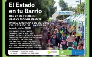 Desde este martes y hasta el viernes funcionará en la localidad de Quilmes, al barrio La Florida "El Estado en tu Barrio" en la Unidad Sanitaria 8 de Octubre, ubicada en calle 829 esquina 891.