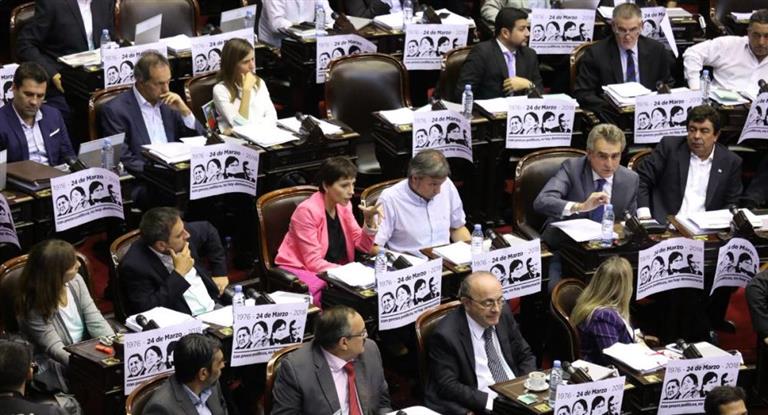La primera sesión ordinaria del año en la Cámara de Diputados no estuvo libre de polémicas. Esta vez el cruce se dio a raÃz de un homenaje por un nuevo aniversario del Golpe de Estado de 1976. Los legisladores del Frente para la Victoria bajaron al recinto con carteles que pegaron a sus bancas en los que podÃa verse las caras de Luis D'ElÃa, Milagro Sala, Carlos Zannini y Julio de Vido con la leyenda "con presos polÃticos no hay democracia". Fue luego de que, el bloque recibiera en sus oficinas de la Cámara a los hijos de Zannini y D'ElÃa, en el marco de la campaña "Por un 24 de Marzo Sin Presos PolÃticos". La acción fue repudiada por el presidente del bloque radical, Mario Negri, quien pidió la palabra para decir que "a 42 años del golpe y a 34 de la recuperación de la democracia, no hay que confundirse". "Tengo una gran diferencia con aquellos que ponen carteles con los nombres de los que tienen que defenderse en la Justicia, eso no tiene nada que ver con lo que hizo la dictadura militar", dijo. "Venimos a recordar para no volver, pero no solamente a la interrupción clásica del orden constitucional, sino profundizar el orden de la democracia, a condenar aquella violación de los DDHH, y las nuevas formas de violaciones que se dan en el mundo", continuó. A su turno, el titular del bloque de Diputados del Frente para la Victoria, AgustÃn Rossi, señaló que "es inconcebible" que un recordatorio sobre el horror de la dictadura "se utilice para cuestionar a los diputados kirchneristas del Frente para la Victoria". "Son dirigentes polÃticos sin condena. Están detenidos injustamente", sostuvo Rossi, sobre los protagonistas de los carteles. |