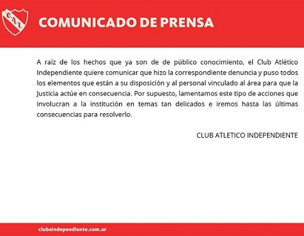 El Club Atl茅tico Independiente de Avellaneda emiti贸 un comunicado de prensa en el que manifiesta que "denunci贸 y puso sus elementos a disposici贸n y al personal vinculado al 谩rea para que la Justicia act煤e".