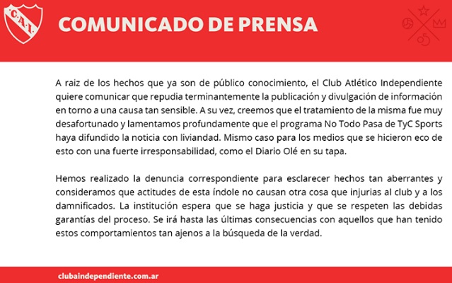 | Independiente repudi贸 la difusi贸n de los nombres de dos jugadores | |||