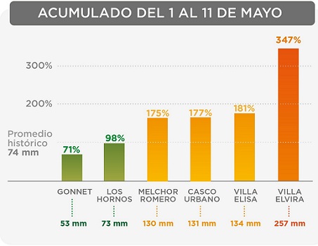 Por ejemplo, en Melchor Romero y el Casco Urbano las precipitaciones registradas alcanzaron los 130 mil铆metros, mientras que en Villa Elisa llega al 134 y en Villa Elvira a los 257 mm, superando un 347% el promedio.