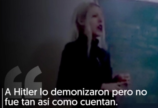 | Una profesora de Historia de 32 a帽os que da clases en dos escuelas cat贸licas del conurbano bonaerense y reivindic贸 durante una clase frente a sus alumnos adolescentes a Hitler y el nazismo, fue separada del cargo y el Inadi analiza denunciarla por incitaci贸n al odio racial, informaron fuentes del colegio y del organismo nacional. Denis Yanet Evequoz, docente de Historia y Construcci贸n Ciudadana de las escuelas Jes煤s Maestro y Santa Magdalena Sof铆a Barat, de Castelar, fue grabada por uno de sus alumnos mientras daba una clase sobre el per铆odo del nazismo. Lo que revela el video, que se viraliz贸 en las redes sociales, es su reivindicaci贸n de Hitler cuando asegura que el l铆der nazi "sac贸 a Alemania a flote" mientras que los jud铆os "se aprovechaban de la gente que necesitaba plata". |