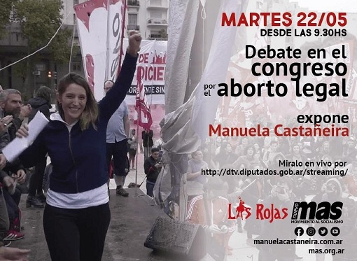Este martes 22 de mayo a partir las 9.30 dar谩 comienzo otra reuni贸n "plenaria" de Comisiones donde se debaten los proyectos de Ley de Interrupci贸n Voluntaria del Embarazo y en la misma hablar谩 Manuela Casta帽eira, dirigente nacional del Nuevo MAS y Las Rojas.