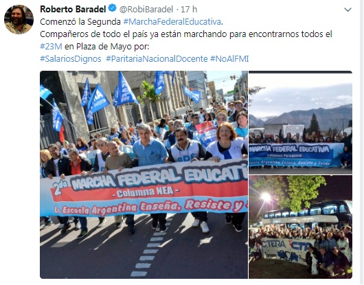 Los maestros bonaerenses comienzan hoy, en este marco, un paro de 48 horas. Roberto Baradel, secretario general de Suteba, denunci贸 que el domingo se cumpli贸 un mes desde la 煤ltima reuni贸n paritaria, sin que los hayan vuelto a convocar. Baradel carg贸 contra Vidal: "No hay di谩logo, la gobernadora no nos recibe. Estuvo 15 d铆as sin hablarle a la sociedad, en medio de la crisis por la devaluaci贸n, y ahora ha salido a los medios a hacer una defensa cerrada de su gobierno y de las pol铆ticas que nos est谩n llevando a una crisis. Lo mejor que nos podr铆a pasar a los bonaerenses es que la gobernadora, en lugar de tanto set televisivo, tuviera m谩s horas de trabajo en la gobernaci贸n para resolver la problem谩tica educativa, de salud, de inseguridad que estamos viviendo en la provincia".