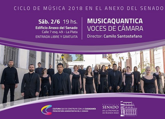 Con la presencia de "MusicaQuantica, Voces de Cámara" continúa el "Ciclo Música en el Anexo del Senado 2018". El recital será este sábado 2 de junio a las 19 hs. en el Edificio Anexo del Senado de la Provincia de Buenos Aires sito en avenida 7 esquina calle 49 de La Plata; siendo la entrada libre y gratuita.