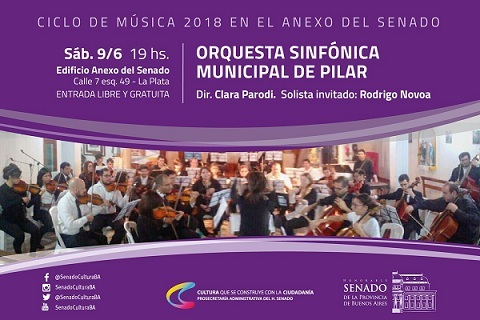Este sábado 9 a las 19 comenzará el concierto que brindará la la Orquesta Sinfónica de Pilar en el Edificio Anexo del Senado de la Provincia de Buenos Aires, sito en avenida 7 esquica calle 49 de La Plata. La entrada es libre y gratuita.